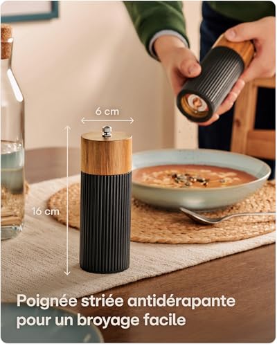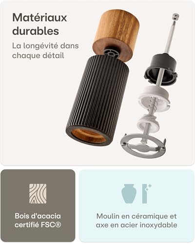 • Fabrication de Haute Qualité : Réalisé en bois d’acacia certifié FSC et en acier inoxydable, avec des finitions artisanales — chaque moulin est une pièce unique au caractère naturel.